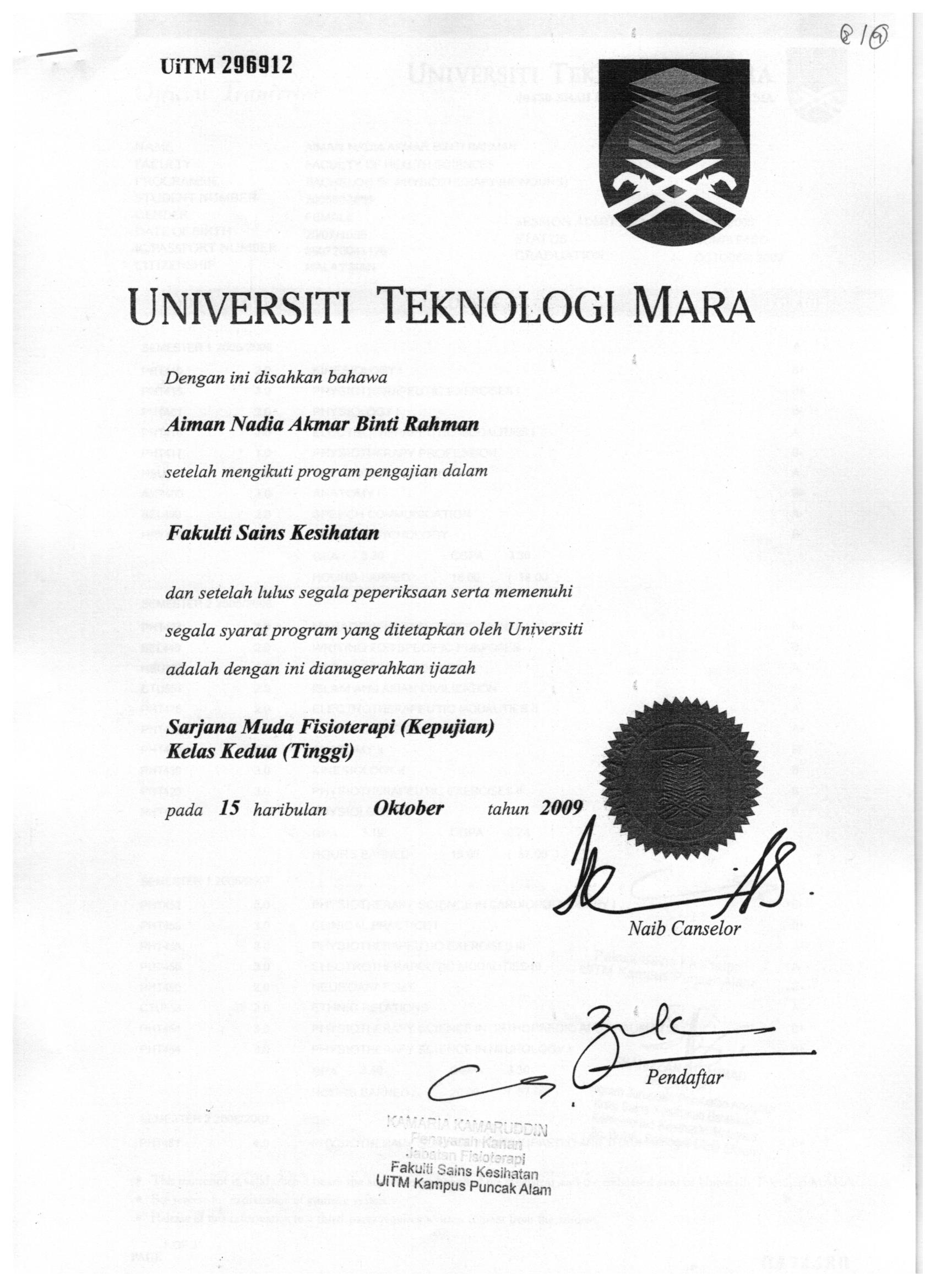 Universiti Teknologi MARA Selangor, Kampus Puncak ALam, Pusat Pengajian Fisioterapi,Fakulti Sains Kesihatan